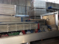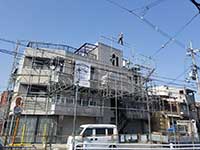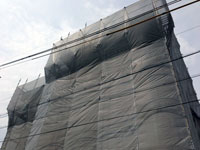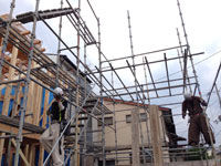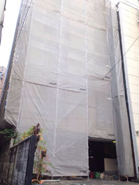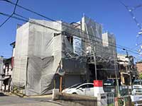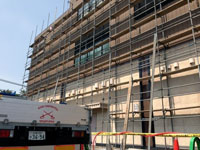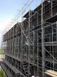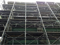 | 枠組み足場 | 鋼管を門型に溶接された建枠にジャッキベース、交差筋違・鋼製布板等の基本部材を組み合わせ、積み上げて構成する仮設足場のことである。 | ||