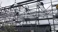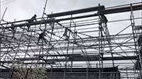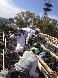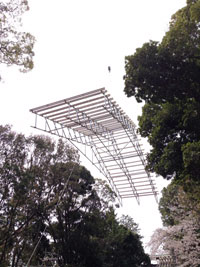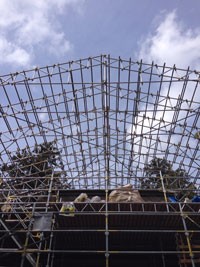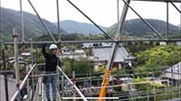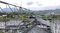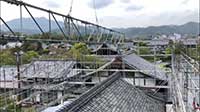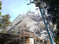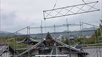 素屋根足場 神社仏閣、重要文化財を中心とした修繕工事等の際、社寺の屋根を護るための仮設社寺足場を素屋根といいます。 国宝や世界遺産、重要文化財を雨風から護るということは当然ですが、素屋根工事では、建物に傷ひとつつけてはいけない!というプレッシャーの中、緻密に慎重に行わなければなりません。 あらゆる屋根形状の屋根勾配に角度をあわせ、天井にはクレーンで取り付けることもあります。 組立方法は現場の状況により異なりますが、素屋根が完成すれば、屋根面は大空間で、天候に関係なく修繕作業ができます。